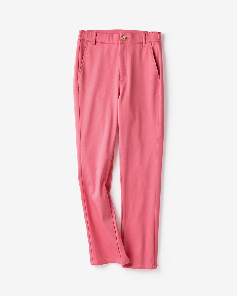 シワや膝抜けも気にならない!ぐんと伸びて、しっかり戻る伸長回復性もこの素材の魅力。