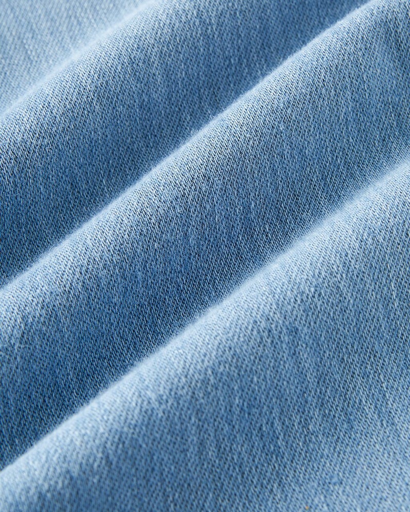 デニムと言えば綾織りですが、このニットdeデニムは編み機を使った特殊製法。本格デニムの風合いをキープしながら、スウェットのように編み立てることで360℃楽に伸びて戻る、抜群の伸縮性を実現しました。