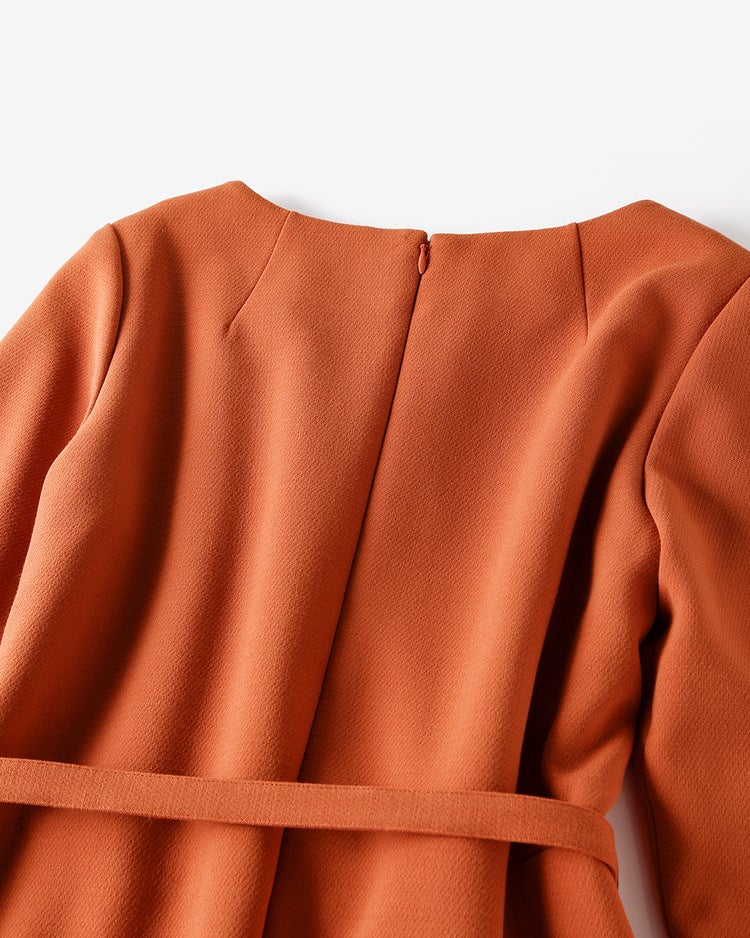 スクエアネックで首元がすっきり見えます。シルエットがきれいで、1日着ていましたが特にシワも気になりません。手首がほっそり見える丁度いい袖丈もお気に入りポイントです。共布ベルトもあるので気分によって使い分けています。
