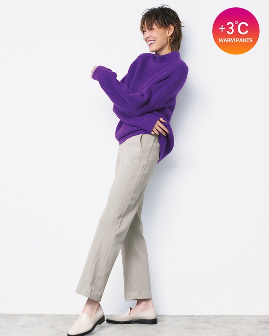 ブーツにも似合うワイドクロップドデザインプレミアサーモは機能だけでなく、大人世代のボディデータに基づいたスタイルアップデザインも魅力。ボディラインを目立たせないワイドクロップドデザインは、特にマダム世代に大人気のスタイル。軽快なクロップド丈は、冬のブーツスタイルにも好相性です。