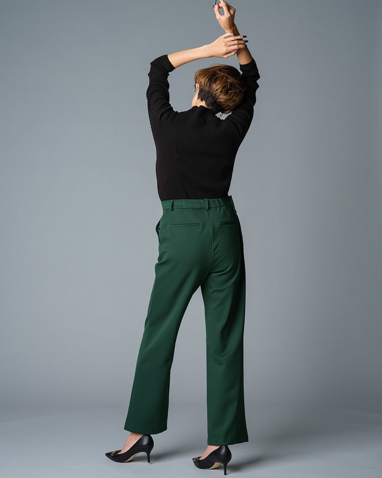 ジャケットにもよく似合う、上品なワイドめのストレートパンツ。お出かけやオフィスにもはいていけるきちんと感のあるパンツですが、じつは裏起毛のカットソー素材ではきごこちは快適そのもの。スポンジのような厚みのあるレーヨン混で、適度な重みがあるのでストンと落ちて、身体をまっすぐに見せてくれます。細い畝のあるツイル(綾織)らしい表面感も上品で、とてもラクちんパンツには見えません。