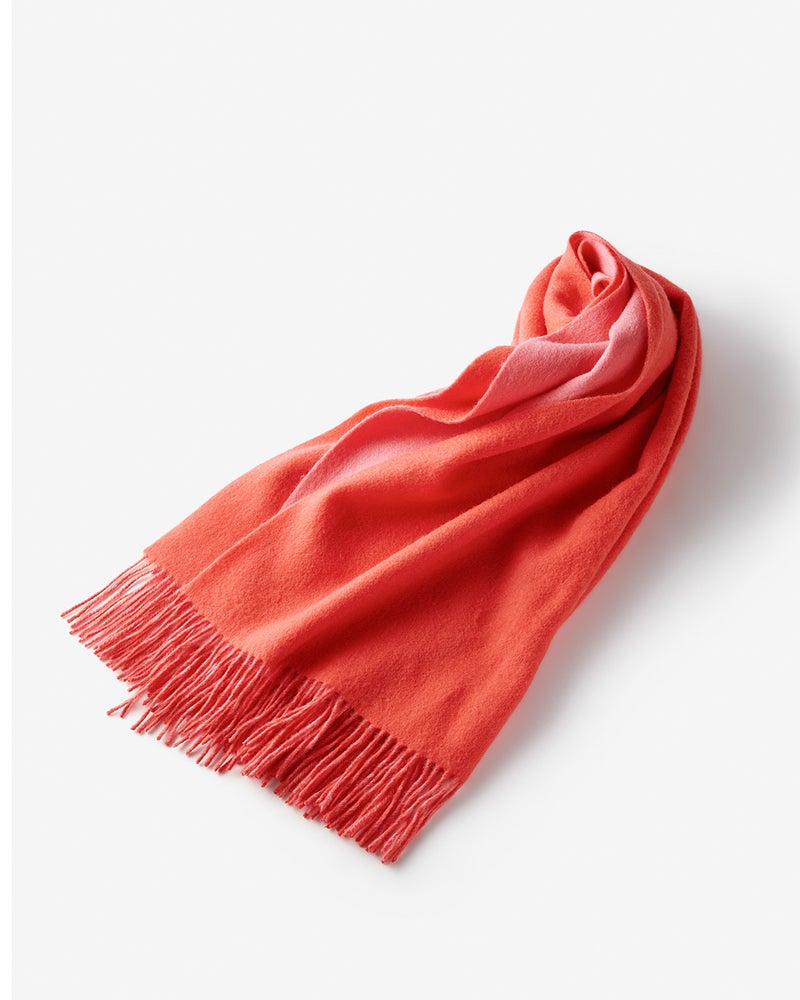 ダブルフェイスウールならではの素材を活かした、表裏異なる色が楽しめるバイカラーストール。コートの色と合わせてワントーンのお洒落を楽しんだり、裏の色をちらりと見せて色遊びを楽しんだり。カシミヤ混のふっくらしたハリと柔らかさは巻くたびに幸せな肌心地です。