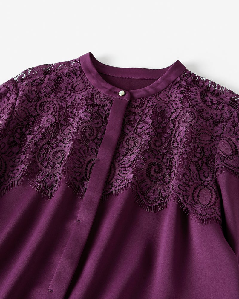 バンドカラーのシンプルなブラウスをベースに、衿~肩まで繊細なレース地を重ねてエレガントに仕上げました。