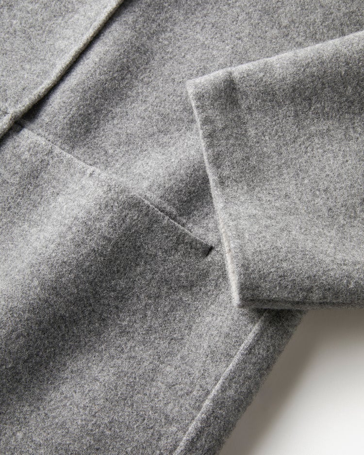 熟練の職人による総手縫い仕立て裏地をつけないウールリバーの美しさは、縫い代を目立たせないテクニックにかかっています。ウール生地を組み合わせ、縫い代にボコつきが出ないよう丁寧にかがっていくという膨大な手間を経て生み出される1着のコート。すべてハンドワークで仕立てるため、熟練の職人であっても生産数は1日にわずか2枚。ふわっと身体になじむ軽い質感や流れるような美しいシルエットは、大量生産では叶えられない手縫い仕立てだけの特別な着心地です。 -
