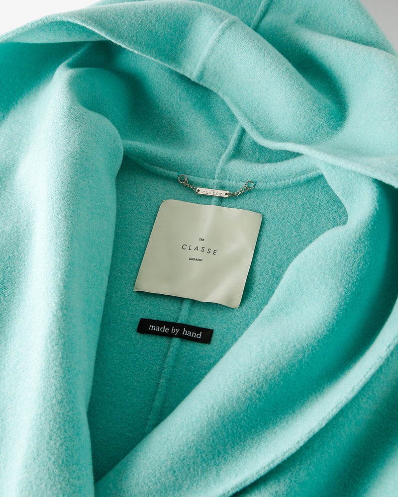 艶のあるカシミヤと生後6ヶ月の羊毛のみを使用した柔らかなジーロンラムをブレンドした、ドゥクラッセだけの極上ウールリバーコートに軽快な春色コートが仲間入り。ふんわりショールカラーからつながるフードデザインが大人カジュアルにぴったり。膝上のミドル丈でパンツにもスカートにも合わせやすいデザインに仕上げました。ウールリバーならではの軽やかなぬくもりは、冬から春へ季節の変わり目にも最適です。