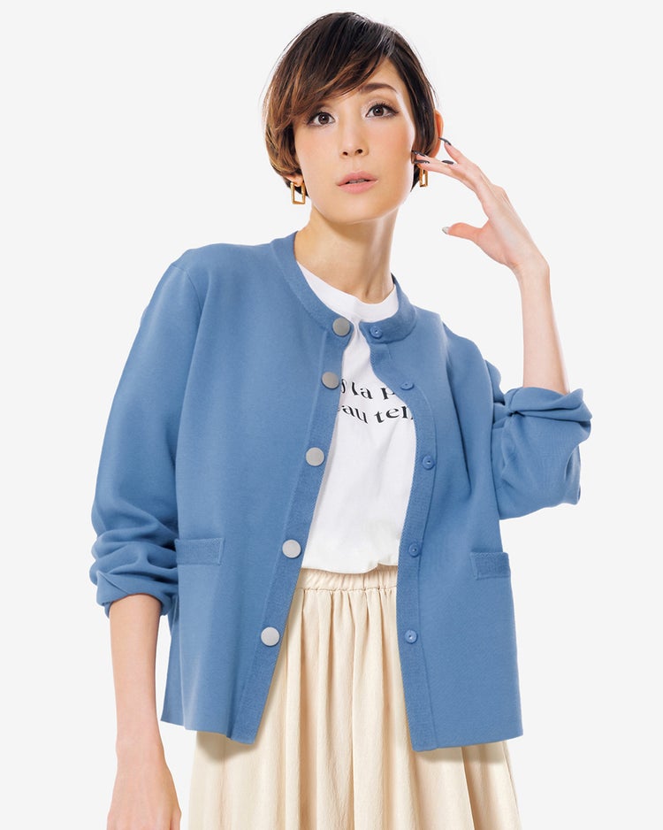 さらっと着られてハリのあるコットン混素材のミラノリブジャケット。コーディネート次第でカーディガン風にも、スポーティなブルゾンのようにも着こなせる、汎用性の広いアイテムです。その秘密は、合わせるアイテムを邪魔せず様々なテイストに寄り添う、シンプルなCカラーとメタル調のスナップボタン。さらに前立てやポケット口を裏目使いした、ニットならではの表情の違いが楽しめるデザインが、大人にふさわしい上質感を添えています。