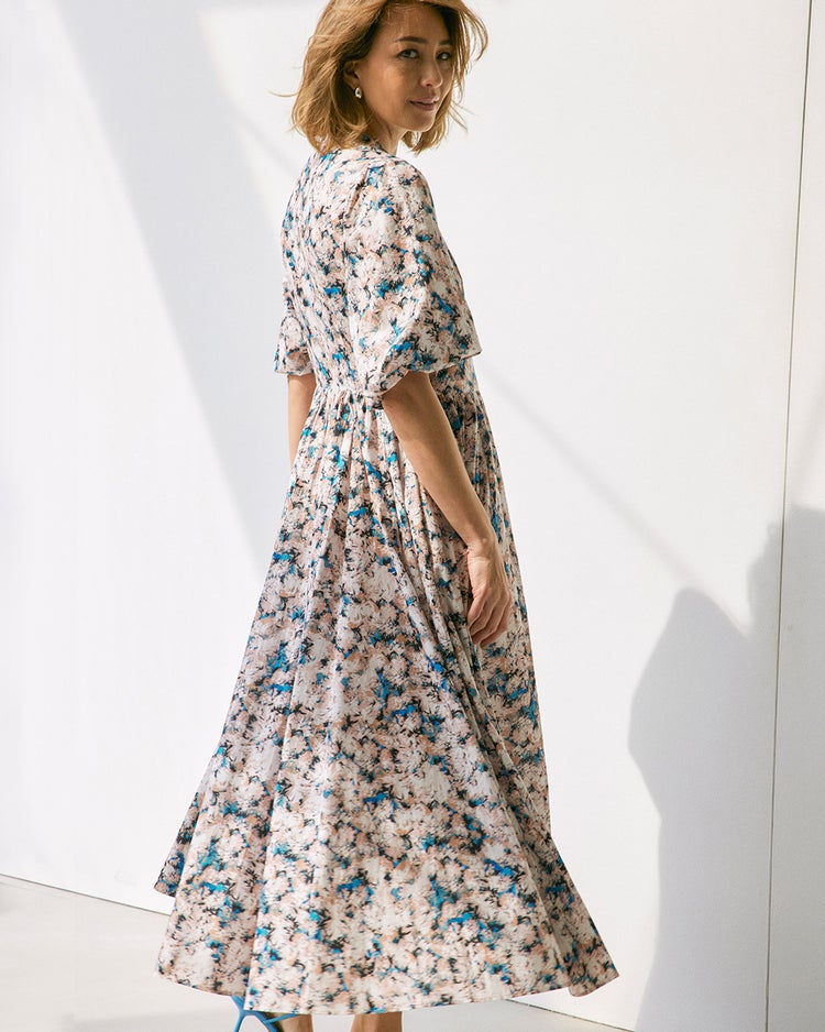 軽く柔らかなコットンローンで仕立てた、顔まわりをすっきり見せるキーネックのロングドレス。胸もとから裾までボタンを備えた前開きデザイン。生地を贅沢に使用したたっぷり量感のあるAラインスカートは、ギャザーをたっぷり寄せて縦に落ちるドレープを表現。動くたびにひらひらと風に揺らめき、女性らしい表情を見せてくれます。