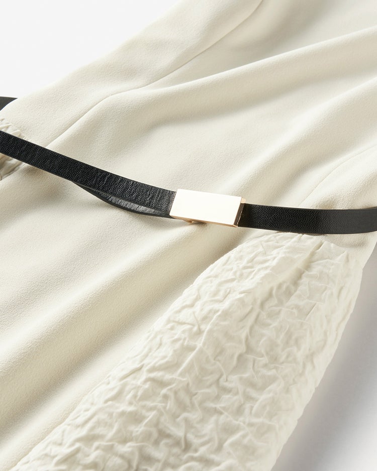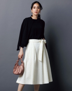 ベースを着心地のよい柔らかなジャージー素材、スカートのサイド部分をふくれジャカード素材で切り替えた異素材デザイン。スカート側面にだけボリュームを足し、ボディ正面をすっきり見せることですっきり細見せを叶えます。