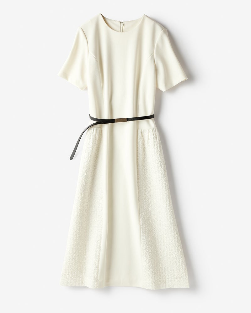無地より華やかに、プリントよりも上品に。立体的に浮き上がるふくれ織りジャカードなら、品格と着映えを両立してくれます。トップスにジョーゼット風の伸縮生地、スカートのサイド部分をふくれ織ジャカードで切り替えた異素材ワンピはオケージョンにも使える品格が魅力。ボディラインを拾わず、ジャカードのふんわり感が楽しめる体型カバーにも優れた1着です。
