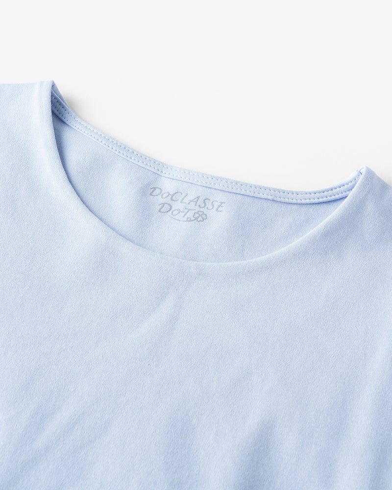 ブランド創成期からのベストセラー、ドゥクラッセTシャツ。1枚で着こなしの主役になる大人のTシャツとして愛されてきました。前身頃を2重に仕立てた下着の見えない機能性、袋縫いで仕上げた贅沢な製法は、正にブラウスやジャケットにも負けない品格のTシャツとして大好評をいただいています。