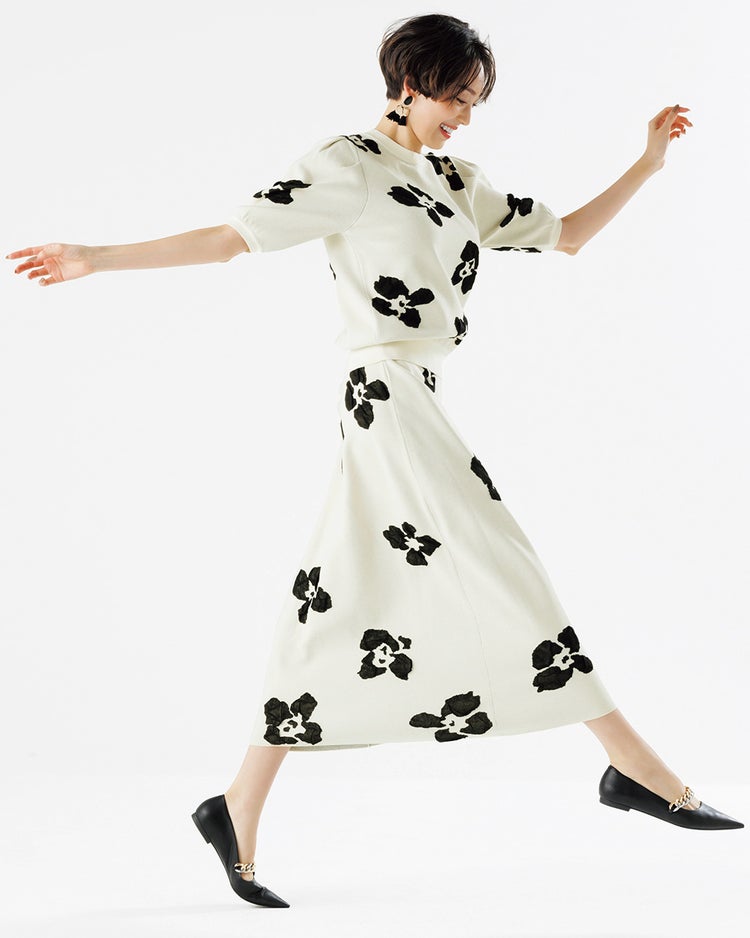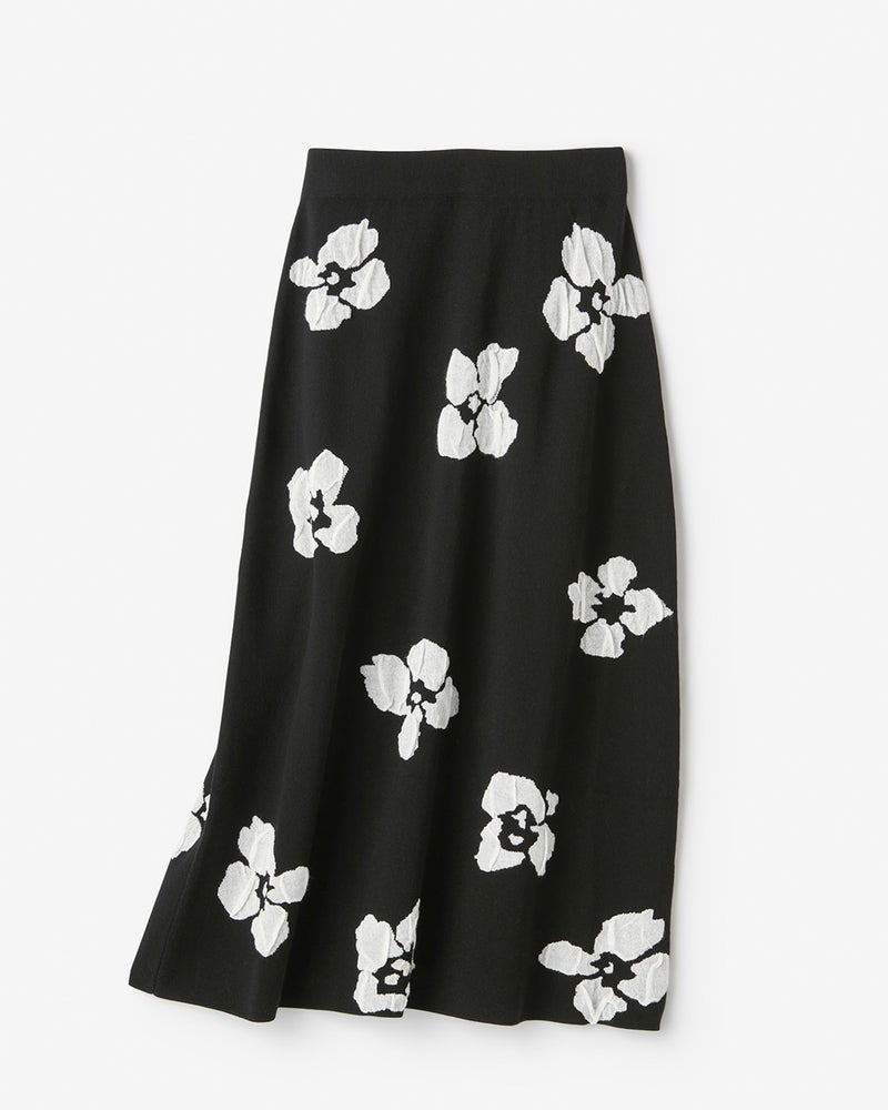 甘さと大人っぽさのバランスが絶妙なニットスカート。ベースはボディラインを拾わないしっかり感のある編地で、花柄が軽やかに浮かび上がる立体的なふくれジャカードが上質感を演出します。