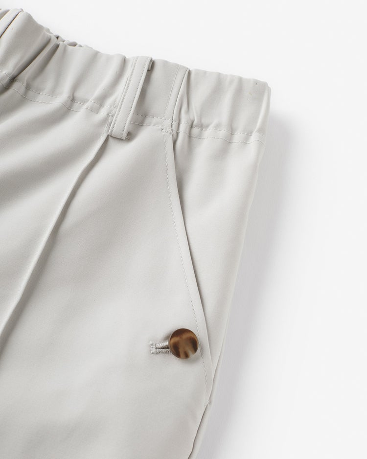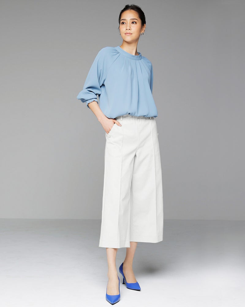 清潔感のあるコットン生地パリッと爽やかなコットン混素材。毛羽を抑えたなめらかでハリのある生地が、上品な印象をもたらします。