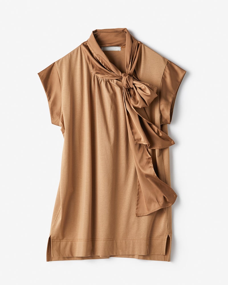 楽な着心地のカットソーでありながら、ボウタイと袖がサテン生地なので高級感が感じられます。