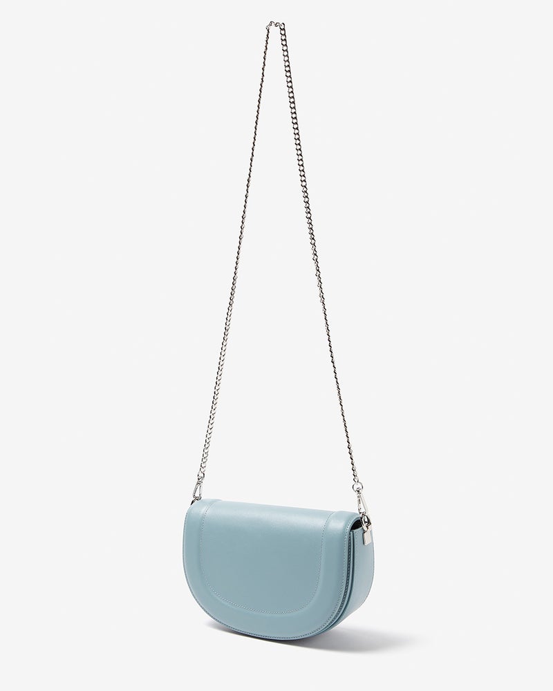 普段のサイズ:F 着用サイズ:F - ころんとしてかわいいです。こんなバックを探していました! 大きさは、スマホ、ミニ財布、ハンカチなど必要なものはなんとか入りそう。ダスティーブルーの色味も落ち着いた印象で合わせやすそうです。手持ちにしてもよいけど、今はチェーンで肩からかけて持ちたい気分です。やっぱり本革は良いですね。