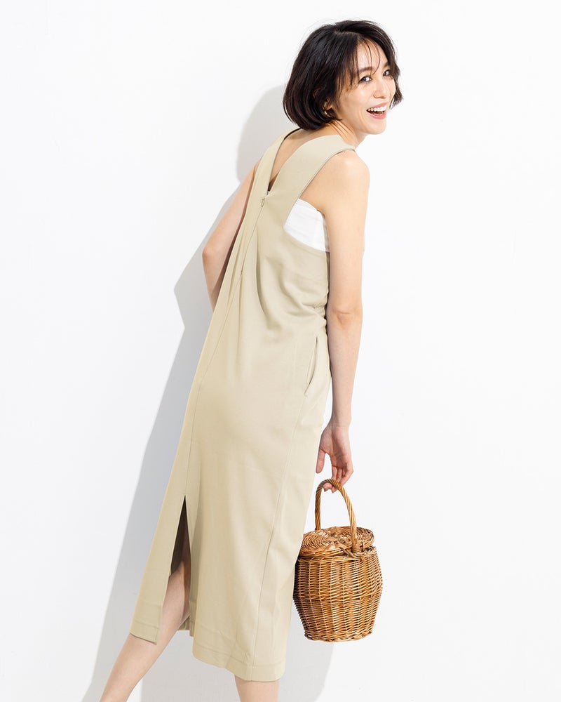 Vのバックデザインになっていて、Tシャツやブラウスと重ねたときの見え方がまたお洒落感◎ポンチ素材で動きやすく、アクティブな予定の日にも持ってこいのワンピースです!