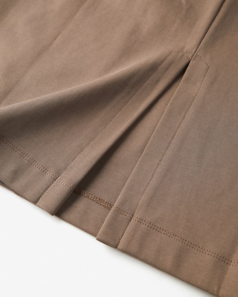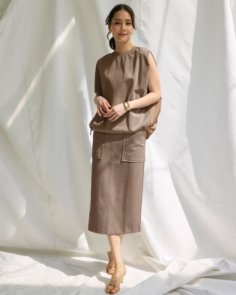 - 15号、ライトブラウンを購入。ヒップラインを拾わないフォルムとなめらかな薄手のジャージー生地のバランスがよく、フロントのポケットは縦感がでていい感じのポイントになっています。パンツ派も着やすいデザインで嬉しいです。