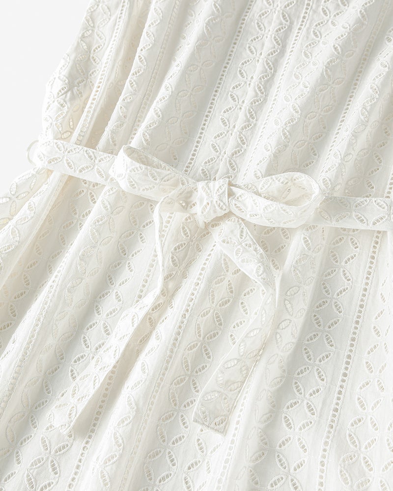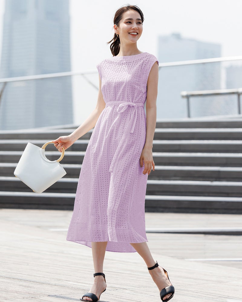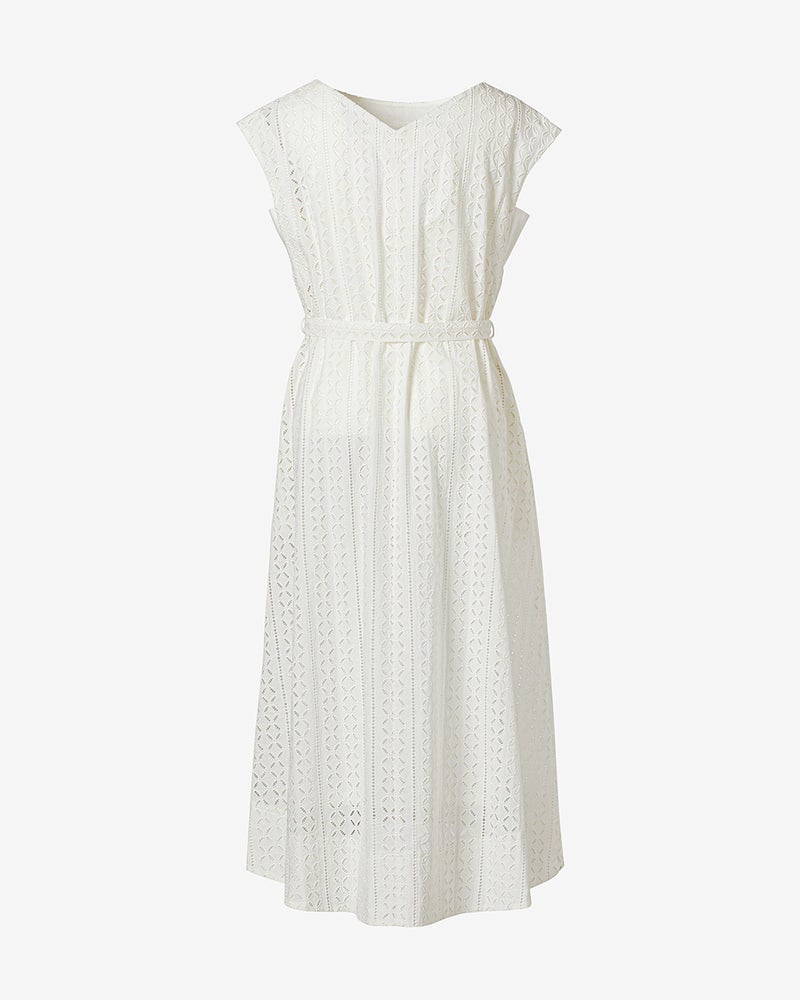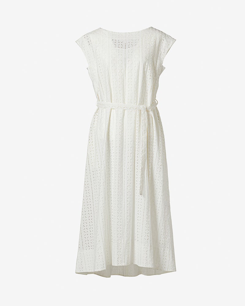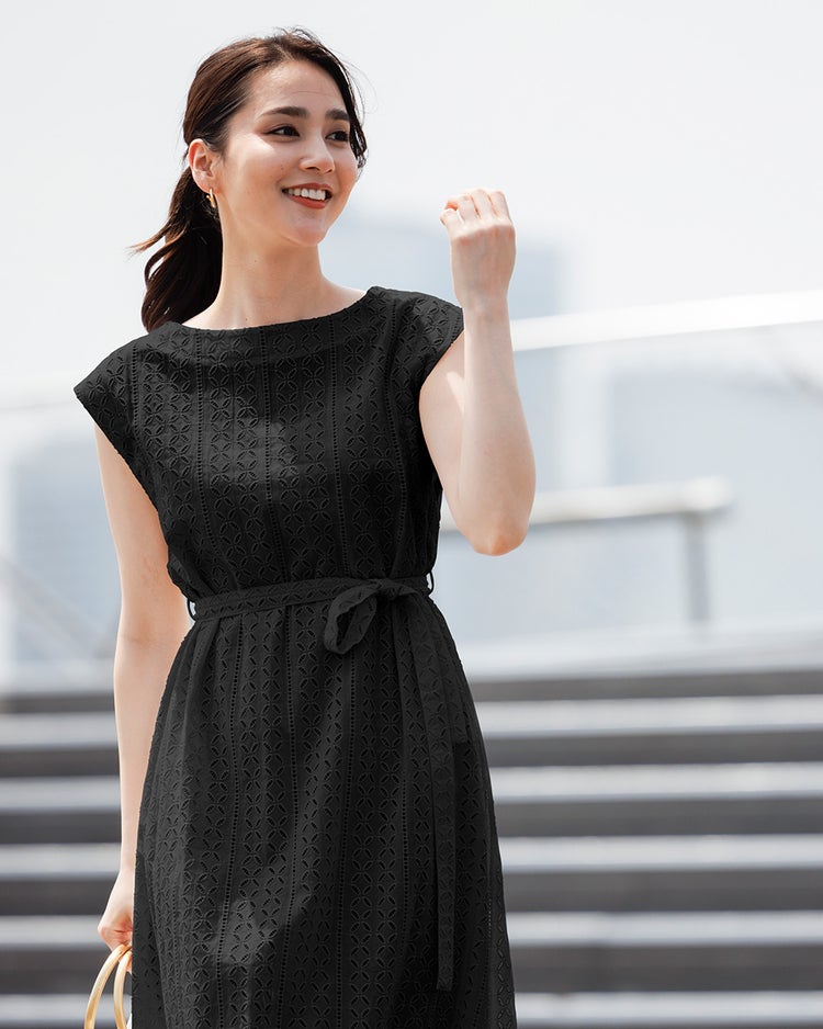 軽くなめらかな風合いのコットンローン生地に、カットワーク刺しゅうを施した、清潔感のある華やかさの総レースワンピース。首もとは前がボートネック、後ろは背中をすっと美しく魅せるV開き仕様。大きく開いたアームホールも、脇下にカットソー素材で”重ね着風”のマチをつけることで、大人が着こなしやすい抜け感デザインに仕上げています。広がり過ぎないAラインシルエットは、そのまますとんと着たり、付属の共布ベルトでウエストをマークしたり、2通りの着こなしをお楽しみいただけます。透けても安心のインナーキャミワンピ―ス付き。