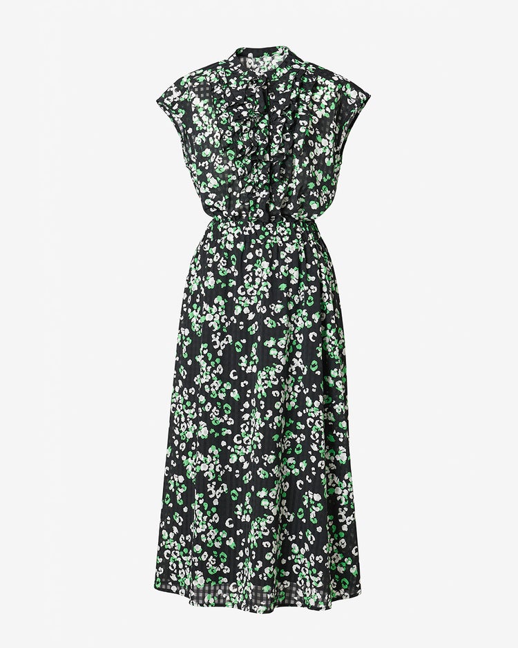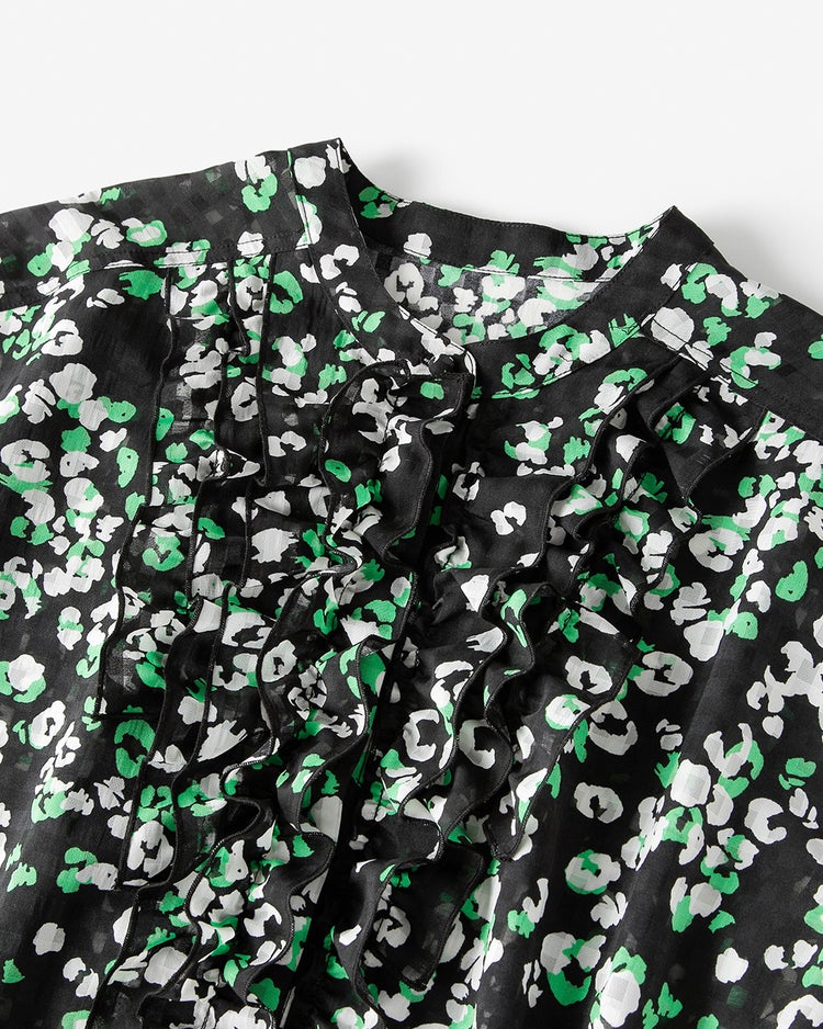 小花柄をプリントしたチェック織りのシアー素材黒地に白とグリーンのフローラルプリントが華やかなシアー素材。ほのかに見えるベースのチェックがプリントに奥行きを生み出しています。