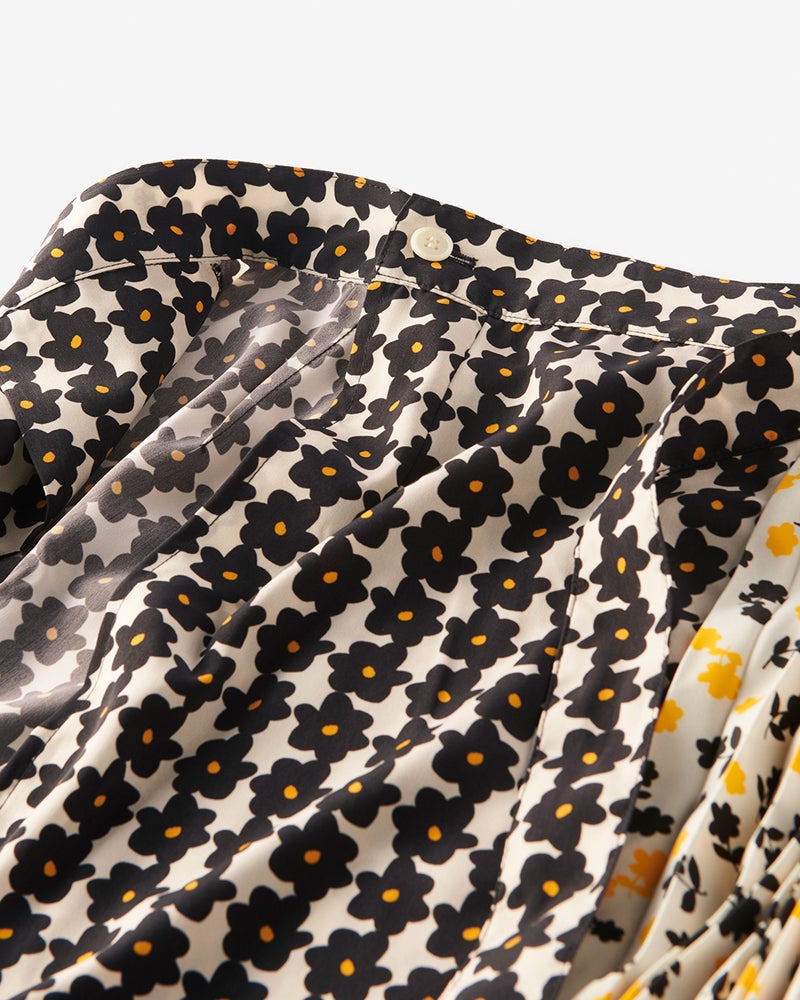 複数のモチーフを組み合わせるパターン使いは、今季のトレンドのひとつ。プリーツスカートにハーフラップスカートを取り付けたデザインだから、足もとがはだける心配もありません。同素材のブラウス(商品番号12929)と合わせて、セットアップスタイルもお楽しみいただけます。
