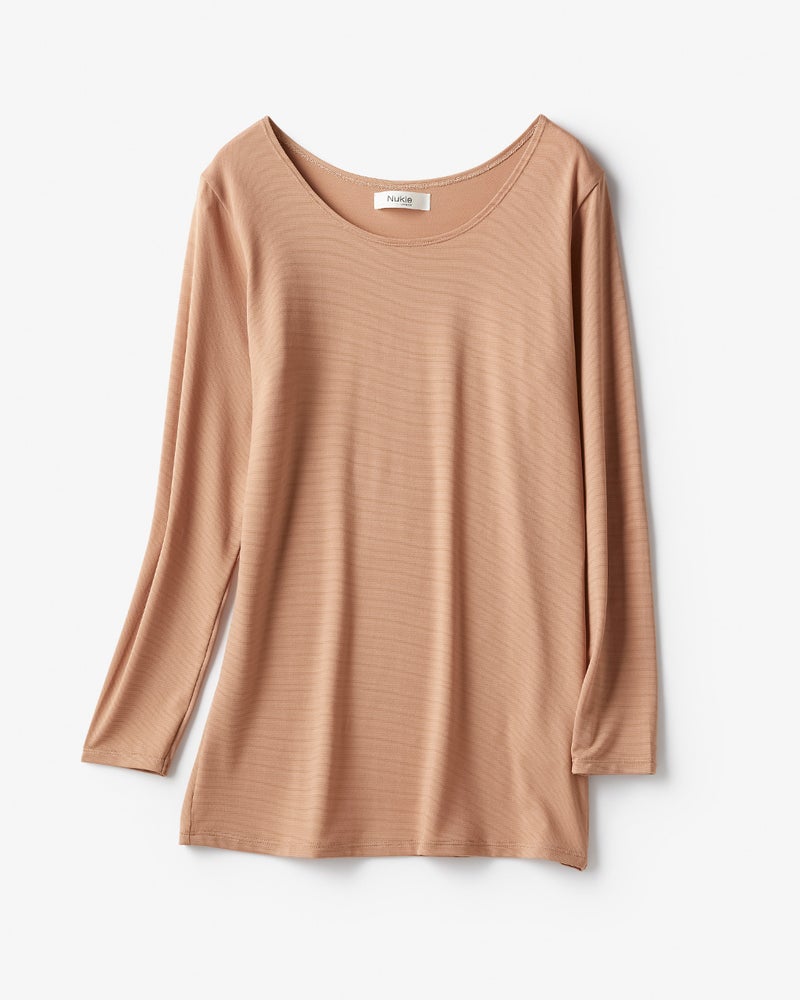 ニットやシャツの下に来てもはみ出しにくい広めのネックライン&9分袖デザイン。着ぶくれゼロの薄さでありながら、Nukle製品に共通するじんわり響くぬくもりはしっかりと。さらに、マイナスイオンと遠赤外線が肌のうるおいを逃さず、カサつきがちな冬の肌もしっとりキープします。