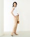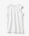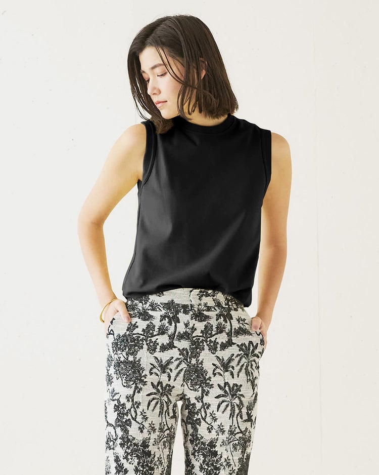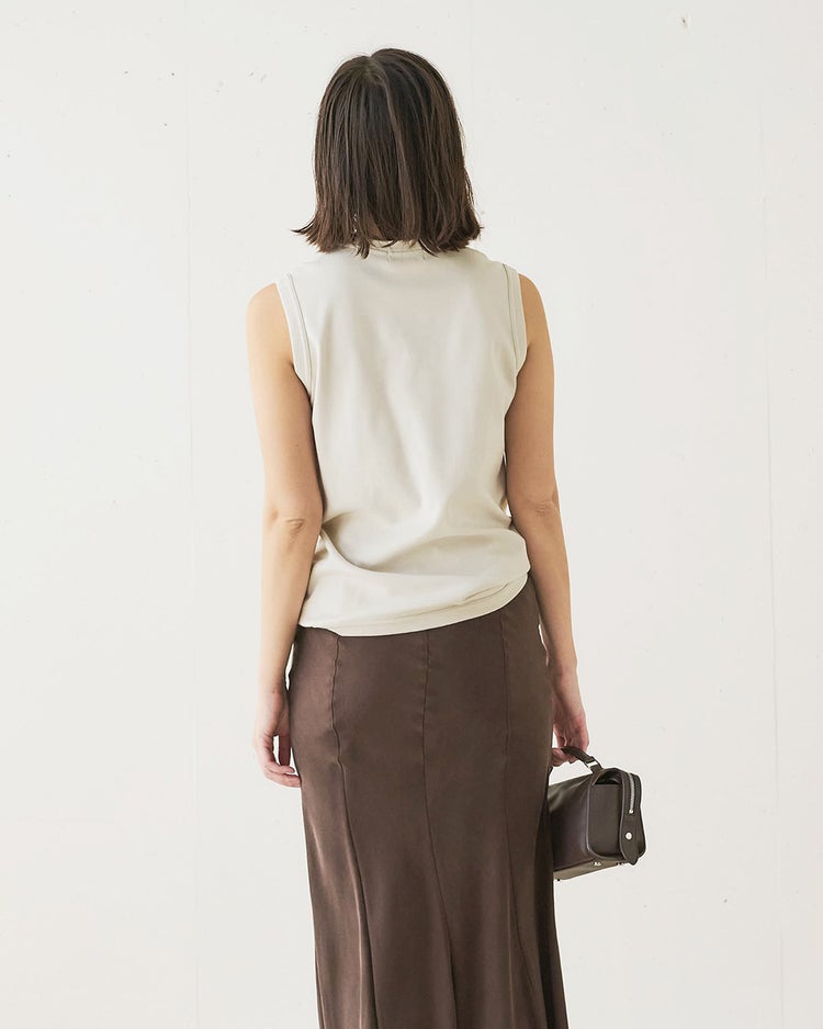 立体裁断技術私達がこだわったのが、大人世代の女性の身体をワンサイズ細く見せながらTシャツならではの心地よさも高めること。 背中や身頃はボディの肉感を拾わない絶妙なゆとりシルエットに、少し痩せたデコルテをカバーするように衿ぐりは少し詰まり気味でコンパクトに、ノースリーブの袖ぐりは前を少し深く、うしろを広めに覆って二の腕をすっきりと。衿と袖をリブ生地で切り替えることで型くずれを防ぎながら、大人に似合うカジュアルテイストに仕上げました。