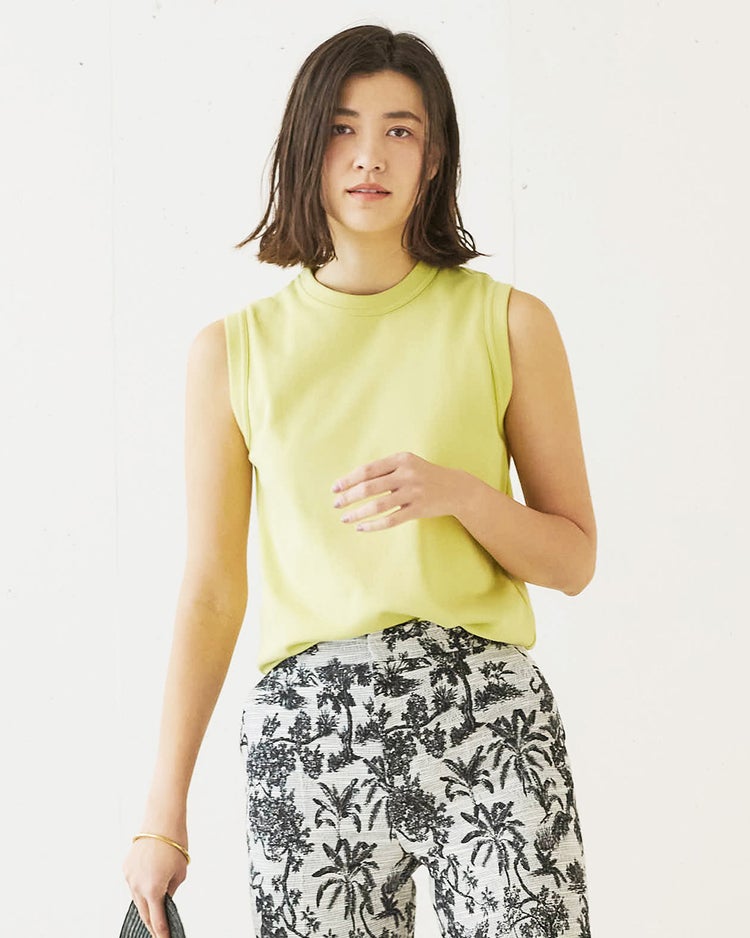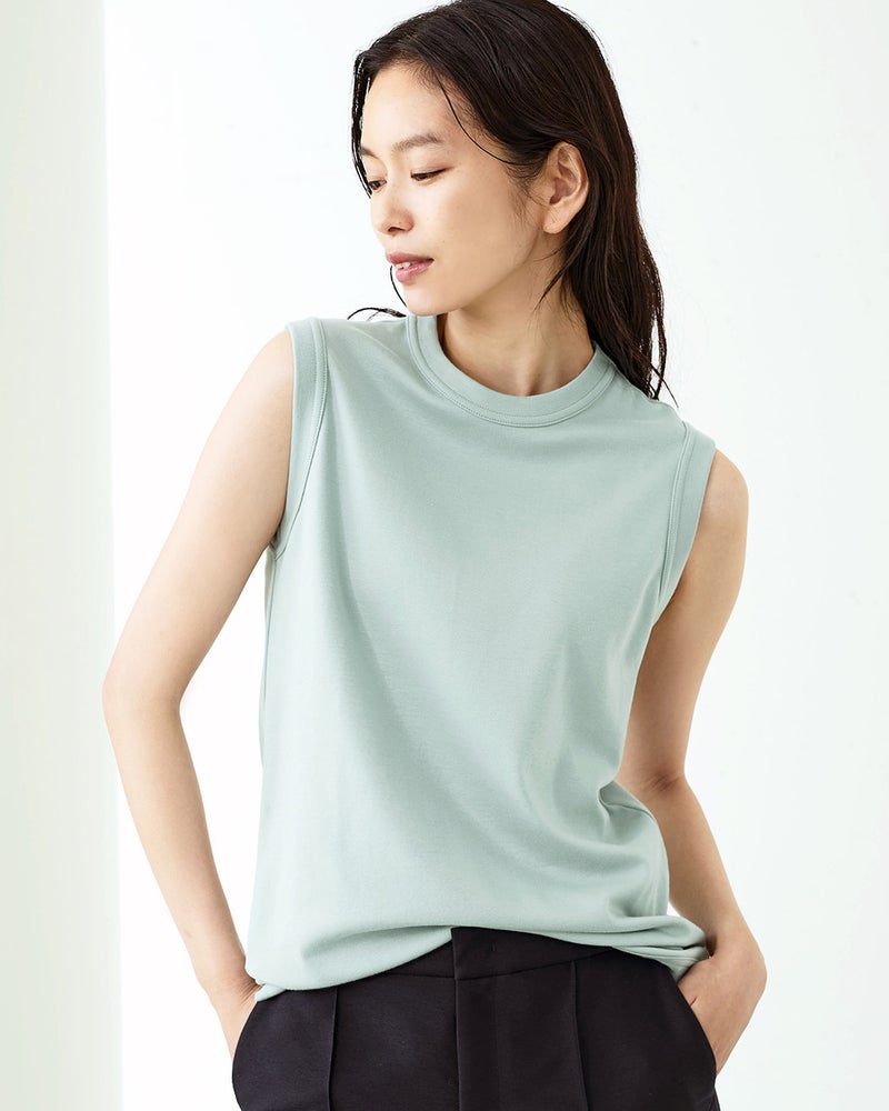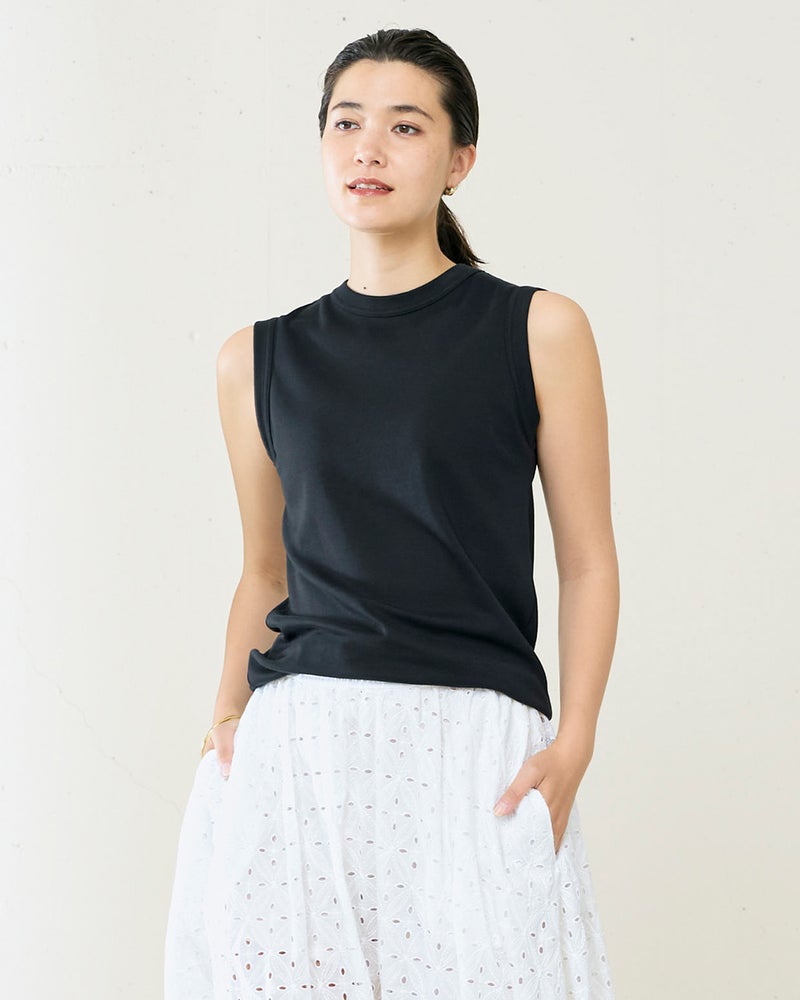 生地がしっかりしていて身体の線が出にくく、袖ぐりも深すぎず、生々しくならないので、ノースリーブでも抵抗なく着られます。