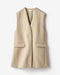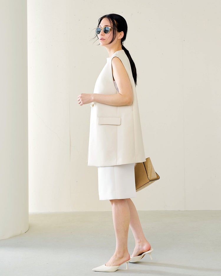 大人のためのエレガントジレ首もとからバストにかけてのエレガントなシルエットが特徴のノーカラージレ。アームホールのカッティングはデザイナー谷川順子のキャリア40年以上に渡る立体裁断技術によって腕を細く見せる工夫が施されているので、ノースリーブのTシャツの上に着てもすっきりと着こなせます。