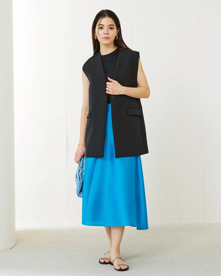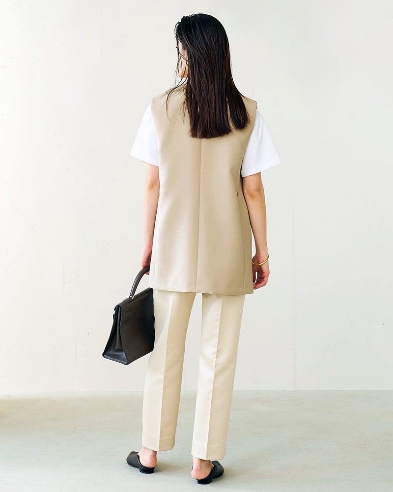 シンプルで着回しやすいジレなので、スリムパンツはもちろんワイドパンツなどどんなアイテムとも合わせやすいアイテムです。