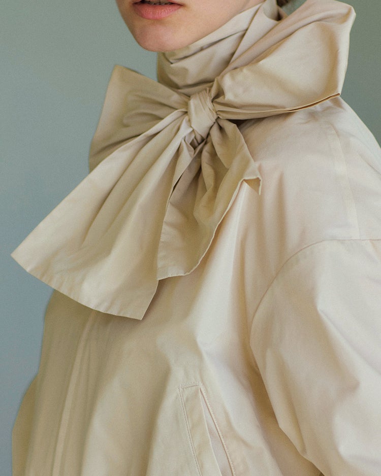 ブルゾン兼ブラウスの新鮮なアイテム今シーズン注目のMA-1スタイルをレディな艶素材で仕立てた、大人のためのトップスがこちら。前を空けてさっと羽織ればスポーティMIXなスタイルに、ジップを引き上げて付属のボウタイリボンを結べば華やかなボウタイブラウスのような着こなしも叶います。