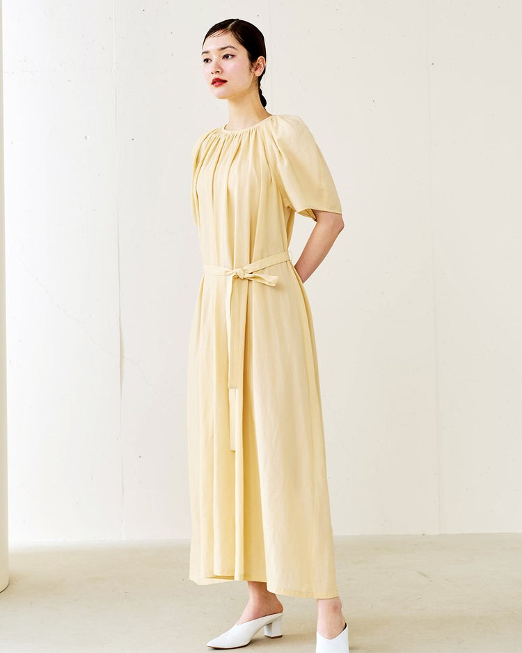 衿もとにたっぷりとギャザーを効かせ、袖を上品なパフスリーブで仕立てた大人の可愛らしさを表現するワンピース。露出を控えたクルーネックラインはカジュアルになりすぎず品の良い印象を叶えてくれます。袖口はギャザーではなく袖山をつまんだタック仕立てにしているので、ボリュームが出すぎず大人にも着こなしやすく。