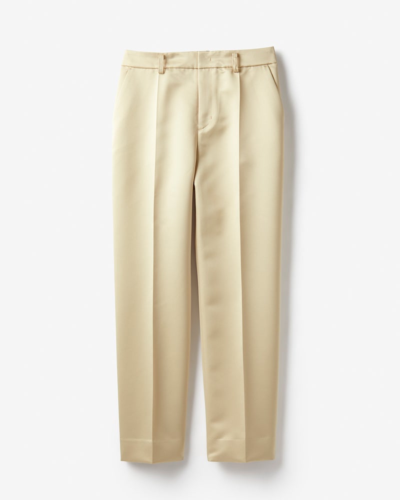 国産の上質サテンが艶を添えるいくつかの素材違いで作っているシガレットパンツですが、中でもこの国産の上質サテンで仕立てた1本はドレスアップにも普段使いにもできる名品パンツ。横糸に伸縮性を持つウーリー糸を織り交ぜることで叶えたふっくらしたハリ感は、肌にはりつかずボディラインを拾わない機能性も。ギラギラしすぎない上品なサテンの輝きが、装いに華を添えてくれます。