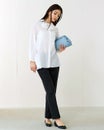 セットアップはTシャツで抜け感をオケージョンやお仕事シーンなどでは、同素材のジャケット(14209 マトラッセクロス・テーラードジャケット)と合わせるセットアップスタイルがおすすめです。インナーはTシャツ(14206バイオ加工超長綿/ノースリーブ)で抜け感を出すと今っぽい仕上がりに。 ベーシックで飽きの来ないデザインなので、シンプルなシャツはもちろんフリルブラウスなど女性らしいアイテムとも相性抜群です。