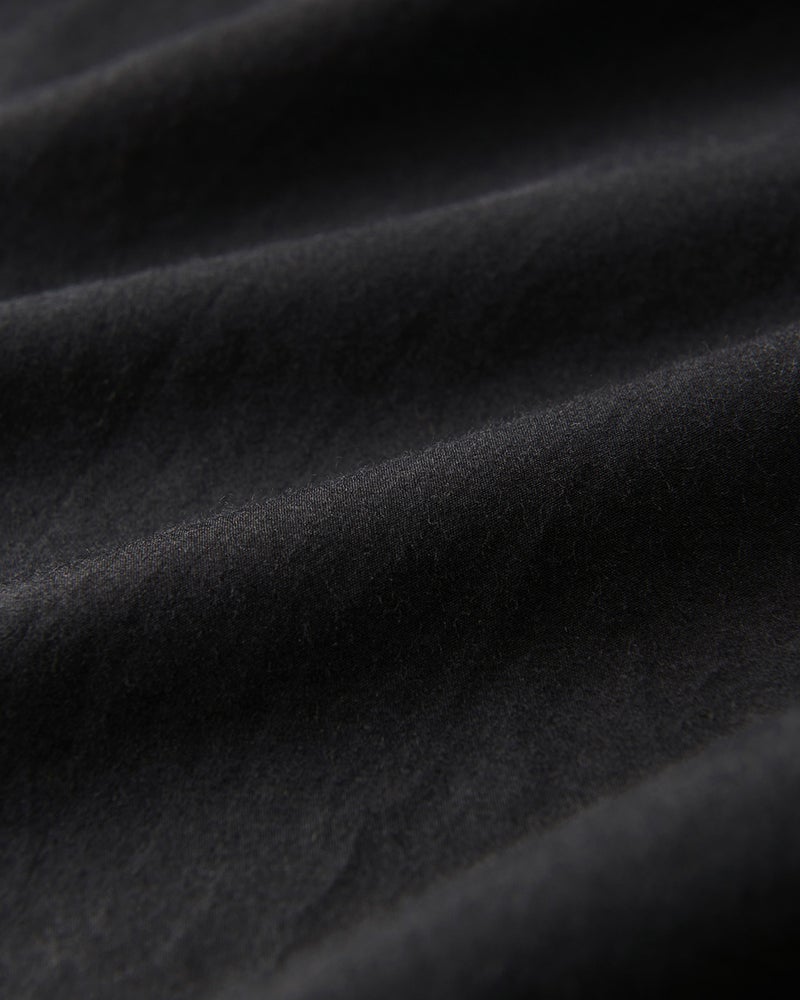 胸元にギャザーを入れ、サイドには深めのスリットが入った女らしいチュニック。表面に微起毛のようなニュアンスのある生地は、高密度タイプライターにシルク糸を打ち込んだ近江地方の高級素材。海外のハイブランドの定番シャツにも使われているパウダータッチの肉厚の生地です。