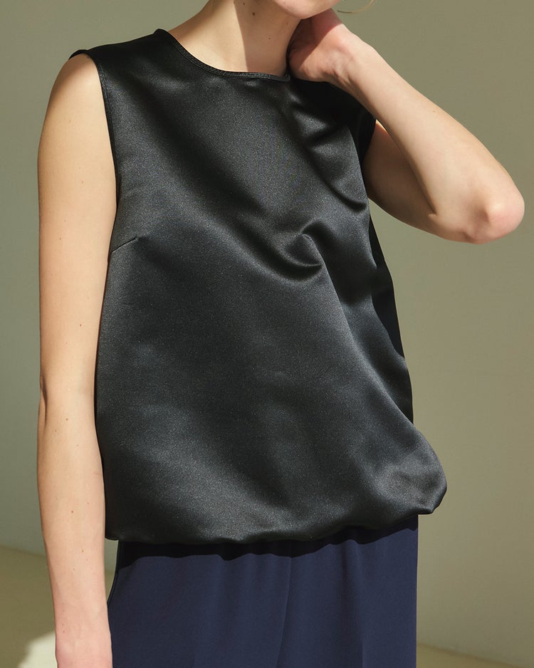 構築フォルムの光沢ブラウスフォーマル、ドレッシー、カジュアルなど、どんなスタイルともすんなりなじみ、1枚でもジャケットインでも抜群の存在感を放つ光沢素材のブラウス。一切の装飾を排した研ぎ澄まされたデザインが、立体裁断やダーツを駆使してつくりあげた構築的なシルエットに息を吹きこみ、着る人の存在感を際立たせます。