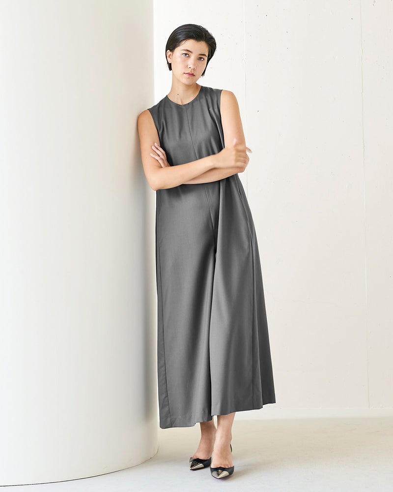カジュアルになりがちなオールイワンをたっぷりと生地を使った贅沢なAラインのフォルムで優雅な大人のための1着に仕上げました。