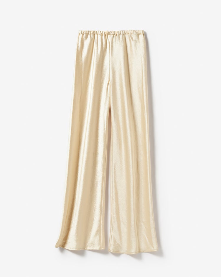 《Point》すとんと落ちるストレートワイドパンツ。サイドに布のはぎをつくらないことで、素材ならではのドレープ感をアピール。ウエストゴムの快適さとラグジュアリーを同時に叶える、シーズンレスな逸品パンツ。