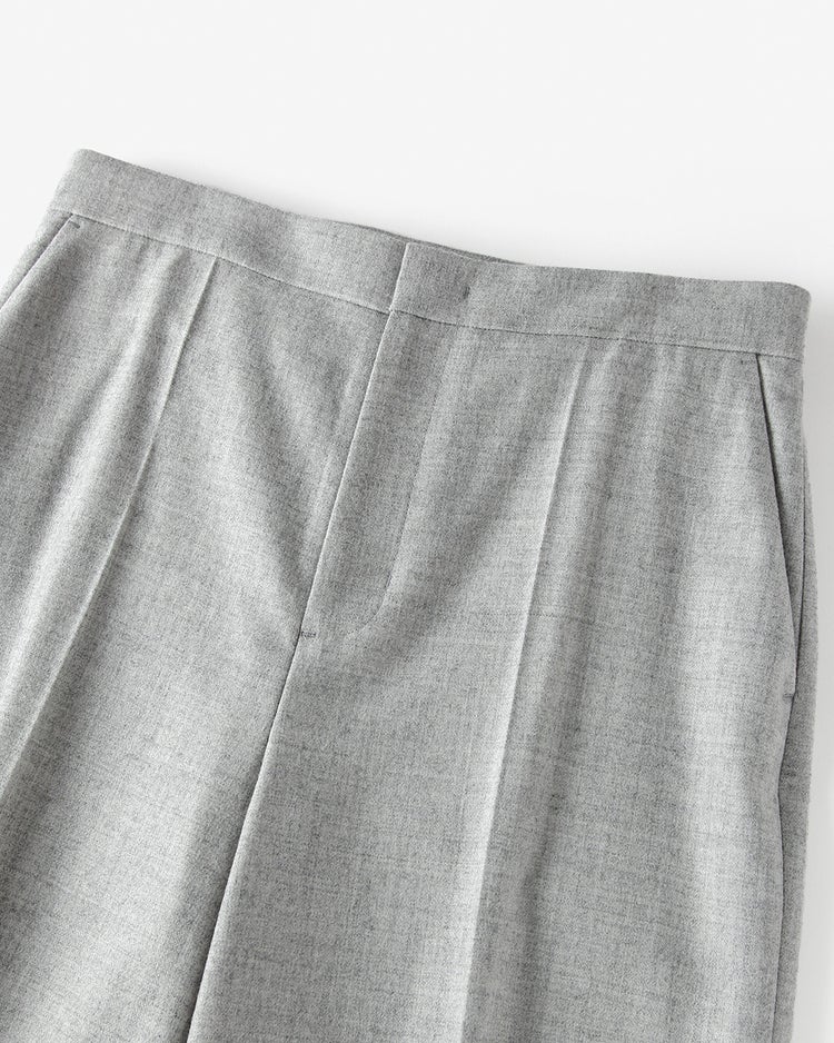 センタープレス入りの太めストレートパンツ。下半身のラインを拾わずすっきりと着こなせるシルエットに。