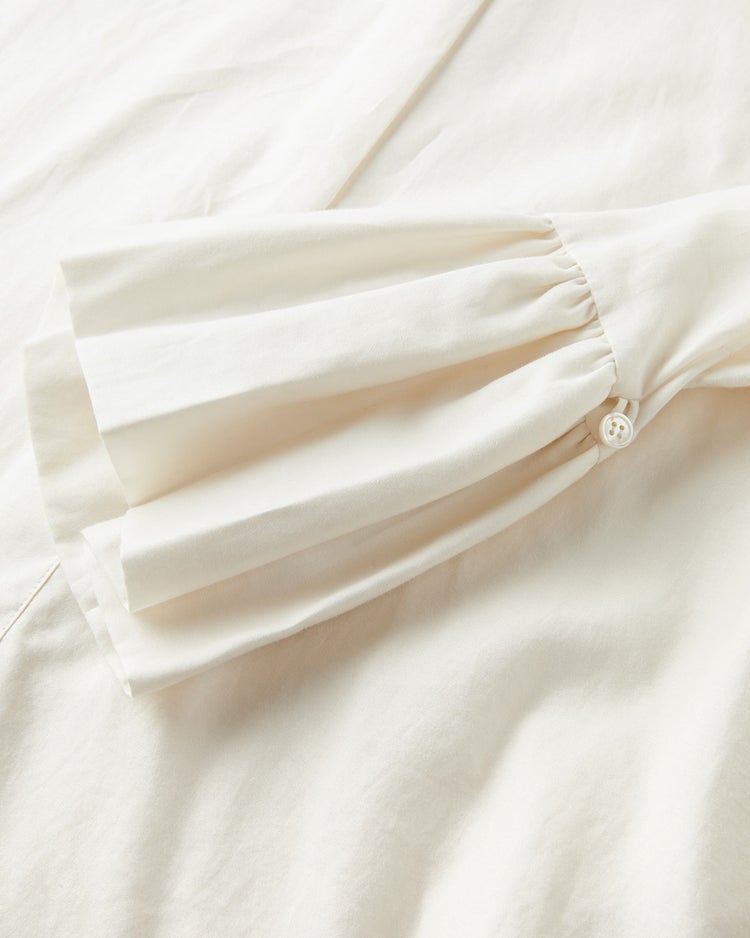 細番手のコットンを朱子織にしたふわっと軽いサテン素材。ワッシャー加工でほのかに凹凸のあるニュアンスをプラス。