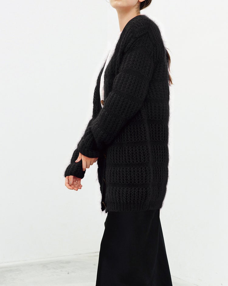 ゆったりしたシルエットのミドル丈カーディ。ふわっと肩に羽織って、肩の力の抜けた着こなしに。
