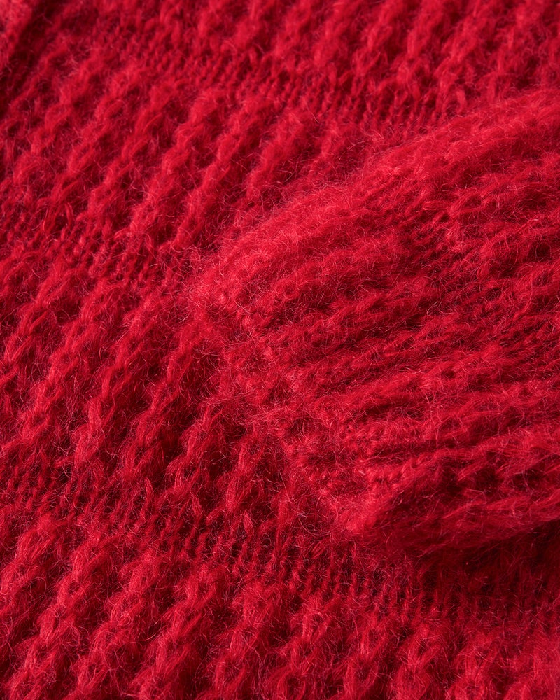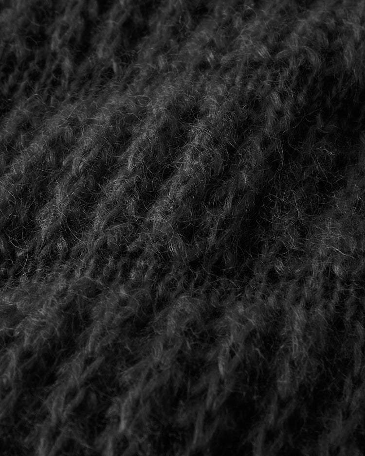 ベビーアンゴラからとった超極細キッドモヘア糸を4本撚糸した貴重なニットヤーン。ざっくりと空気を含ませながら針抜きリブ編で仕立てました。