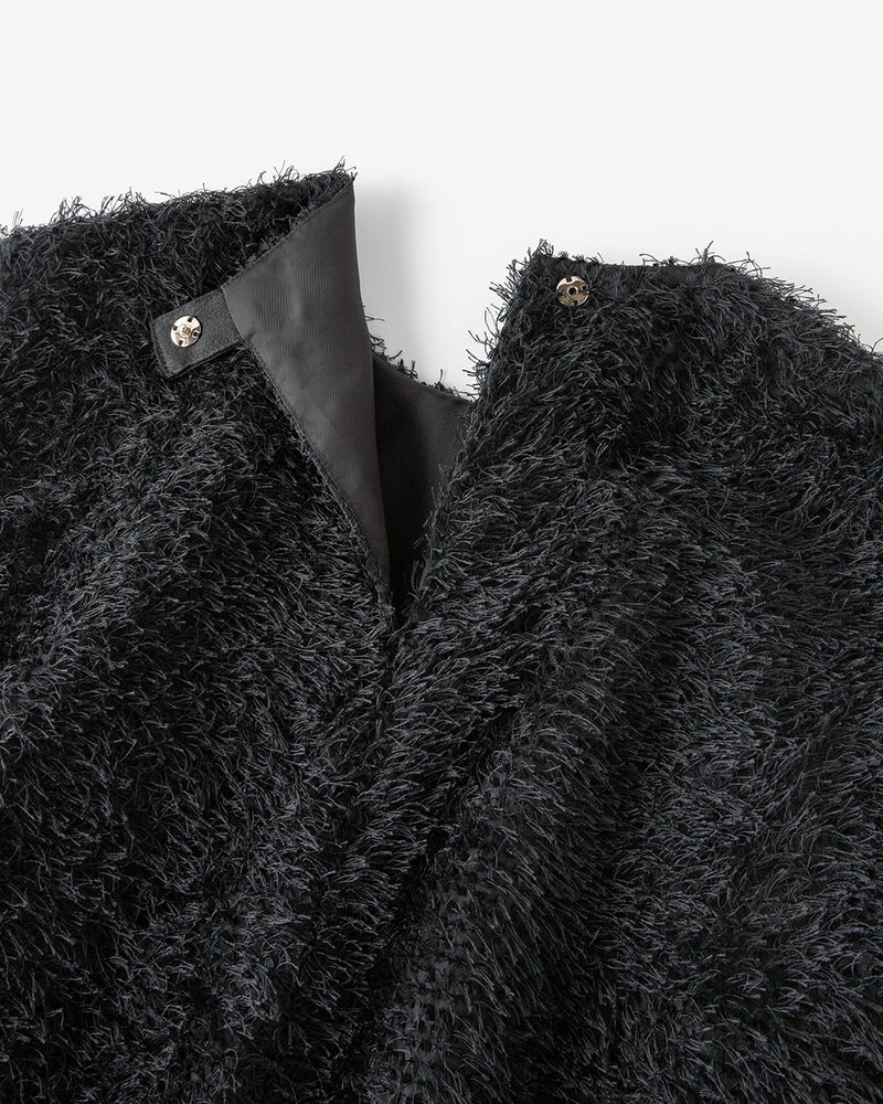 ふわふわしたフェザータッチの毛並みが美しい華やか素材「フェザージャカード」。ニットのように柔らかな素材をベースに、マイクロポリエステルで羽のような軽やかさを実現。桐生の老舗工房が独自開発したカット技術で、束感のある美しいジャカードの毛並みを叶えました。