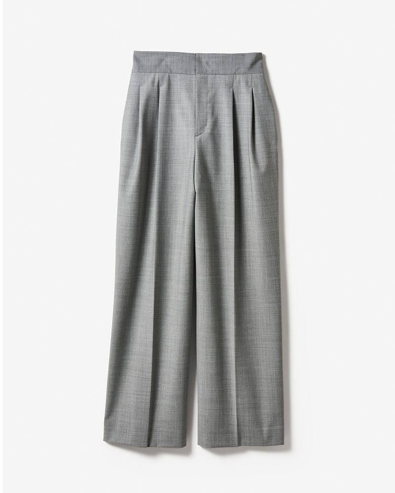 フロントにツータックを施したっぷりしたボリュームを叶えたモードなワイドパンツ。素材はトルコの老舗ウーステッドメーカー「BAHARIYE」社製。極限まで毛羽立ちを落としなめらかに仕上げた2WAYストレッチのMIXウール素材を採用。ドラマティックなボリュームシルエットも、軽やかな素材感と美しい質感で大人のモダンスタイルに。