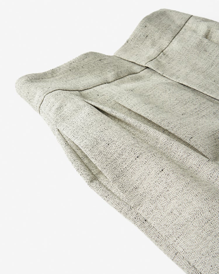 ハイブランドの顧客も多く持つ尾州の老舗ファクトリーが作り上げたヘザーリネンウール。ニュアンスのある杢調の質感や軽やかな着心地が特長の贅沢素材を、ツータックのハンサムワイドパンツに仕立てました。同素材のジャケット(商品番号14352)と合わせてメンズライクに、Tシャツと合わせてスポーティモダン、さまざまな着こなしに活躍する1着です。