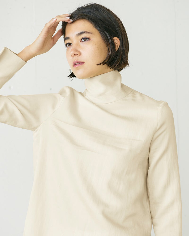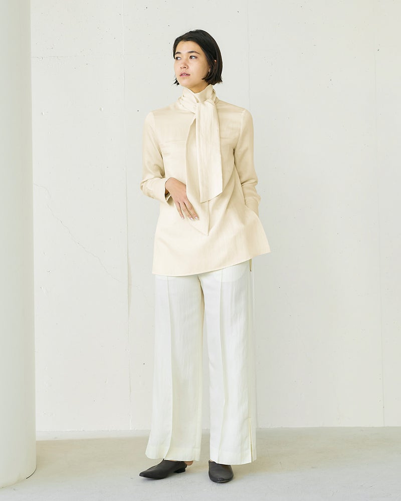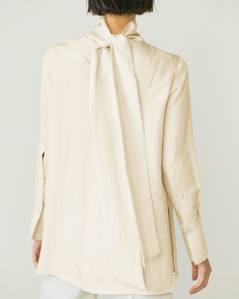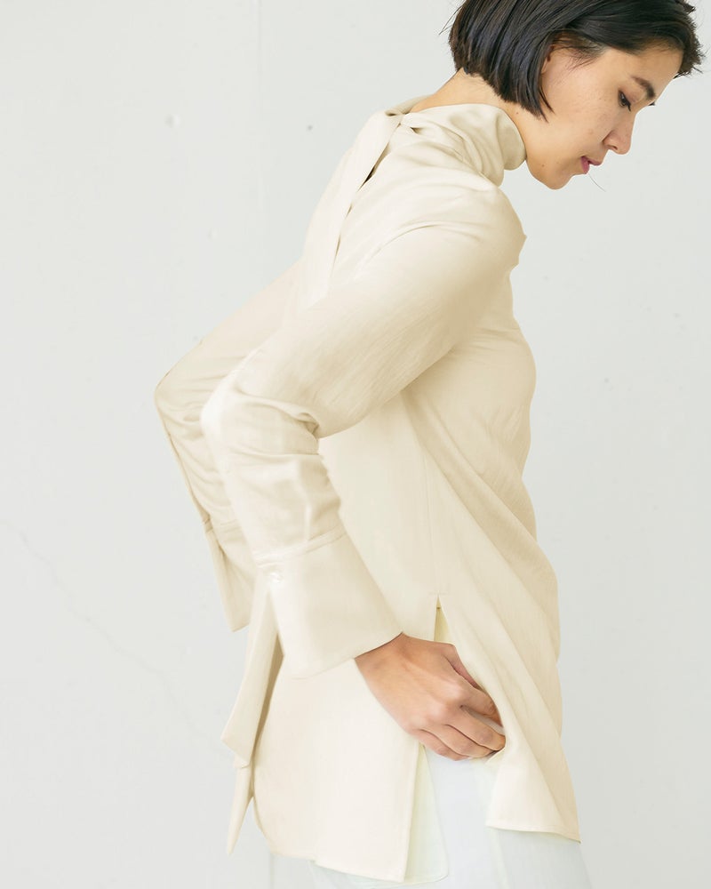 衿高のあるノーブルなハイネックをベースにしたボウタイブラウス。ボリュームのあるボウタイ部分は正面でリボン結びにするほか、横に流したり、後ろに垂らしたりとスカーフのような使い方もできるデザイン。艶のあるヴィスコースをMIXした光沢ツイル素材のドレーピーな質感も、大人の女性の身体を美しく魅せてくれます。
