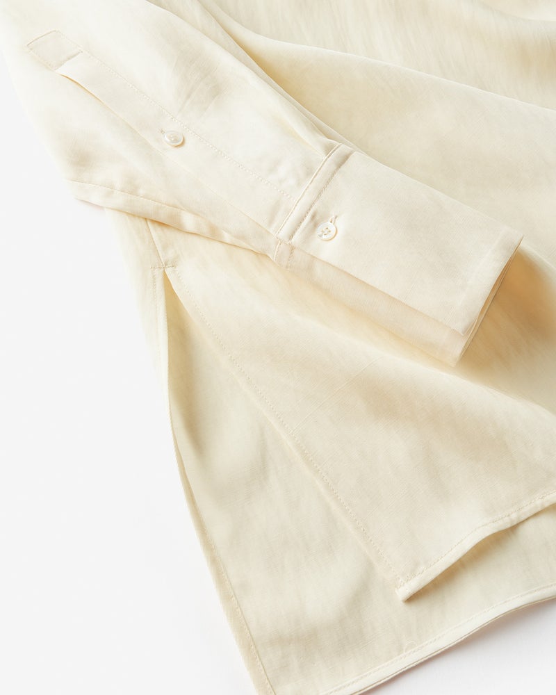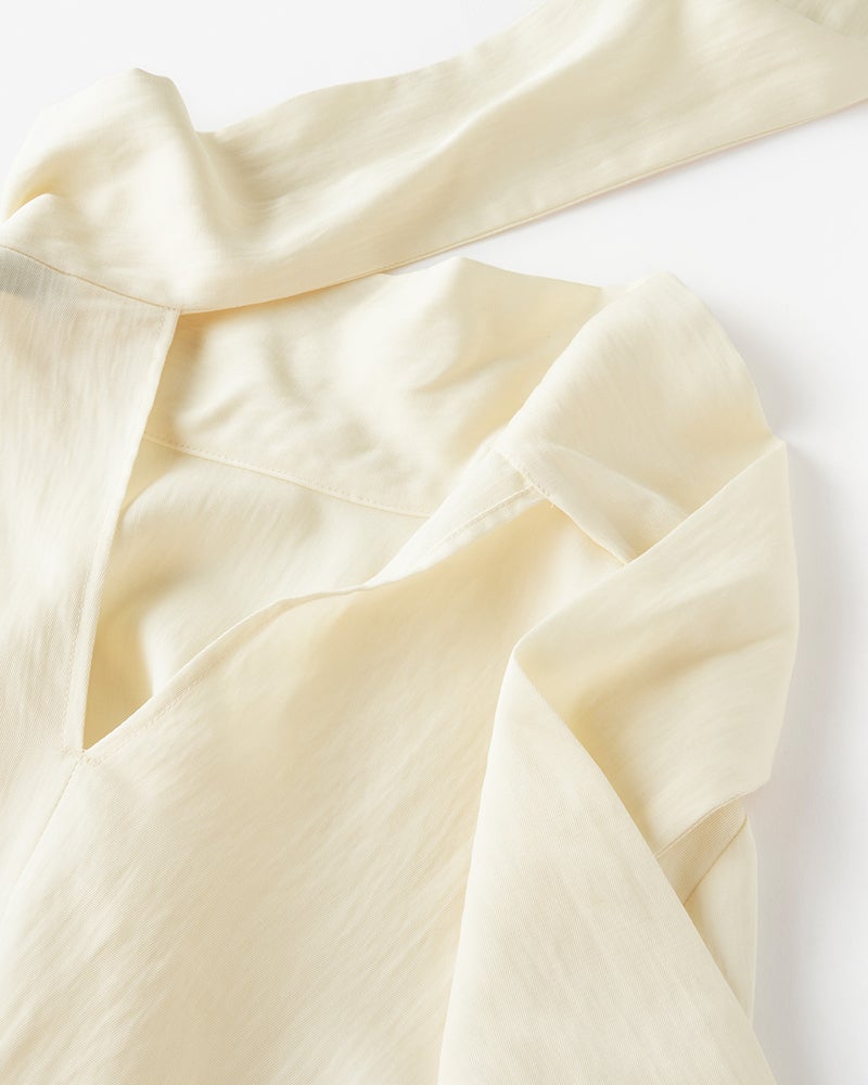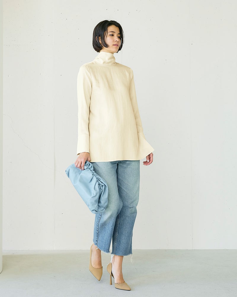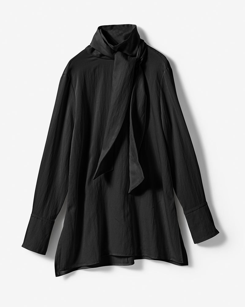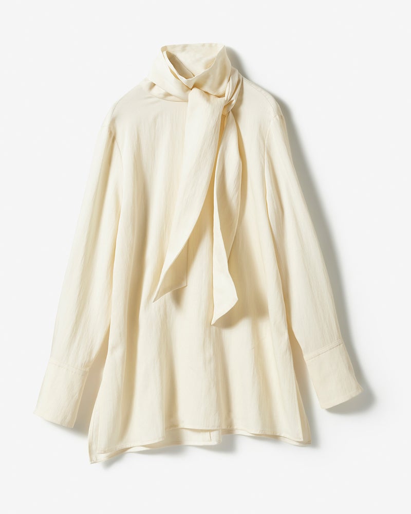 衿高のあるノーブルなハイネックをベースにしたボウタイブラウス。ボリュームのあるボウタイ部分は正面でリボン結びにするほか、横に流したり、後ろに垂らしたりとスカーフのような使い方もできるデザイン。艶のあるヴィスコースをMIXした光沢ツイル素材のドレーピーな質感も、大人の女性の身体を美しく魅せてくれます。