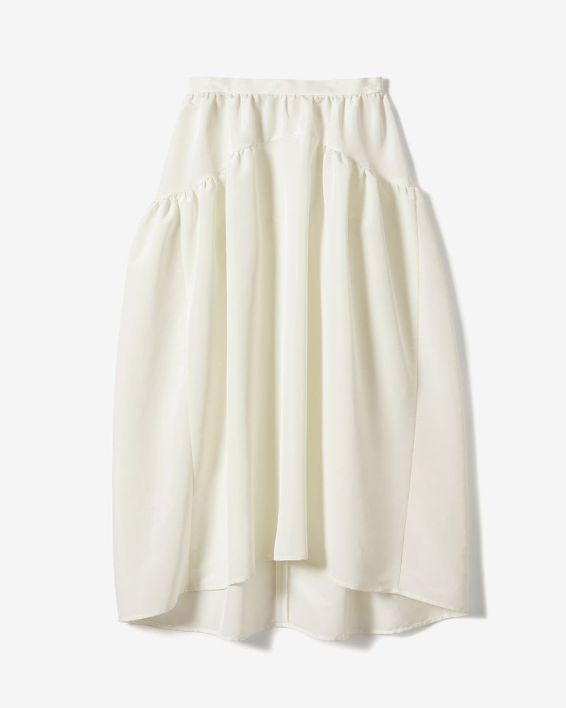 グログランの艶めきと、たっぷりギャザーを入れた贅沢なボリューム感。パーティシーンにもぴったりの、着こなしの主役となるスカート。前後にラウンドするように切り替えを入れ、ふわっとした贅沢なボリューム感を叶えました。パーティスタイルにはもちろん、ざっくりしたニットに合わせたリッチなカジュアルスタイルにも。