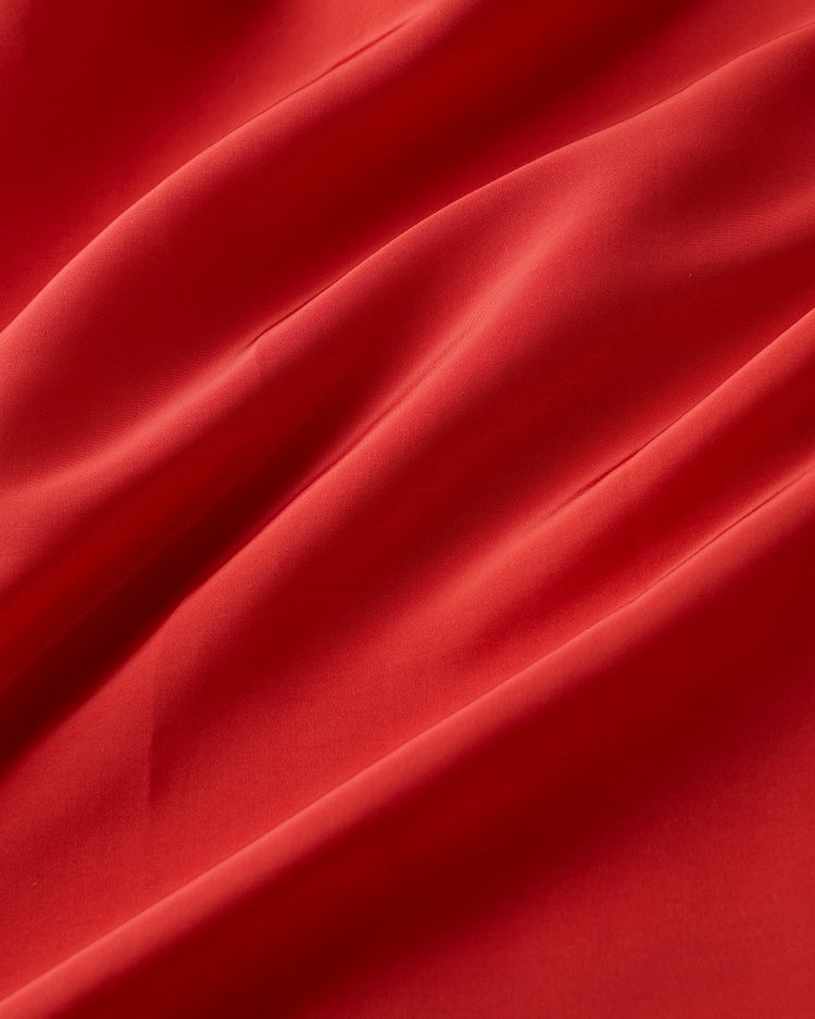 シルクのような艶とふわっとしたボリューム感を持つグロッシーグログラン素材。縦糸にアセテート、横糸にウーリー糸を使うことにより、柔らかな風合いとハリを両立。角度を変えると横糸の光沢が現れる玉虫風の光沢感が、大人の肌をしっとりと美しく魅せてくれます。