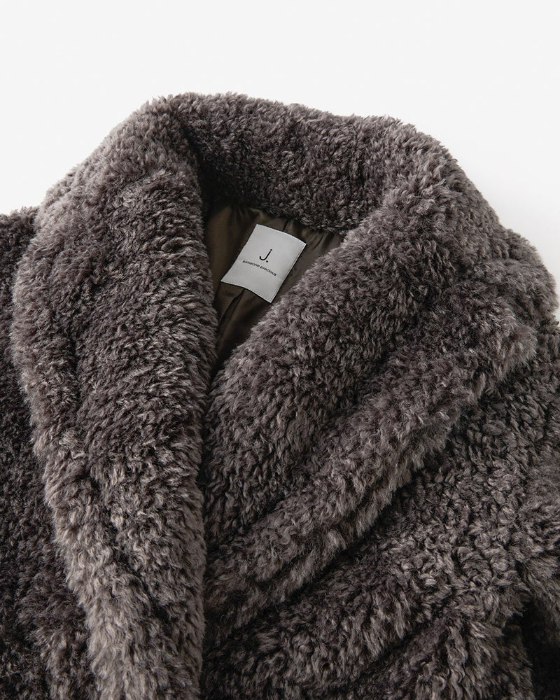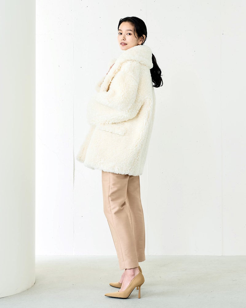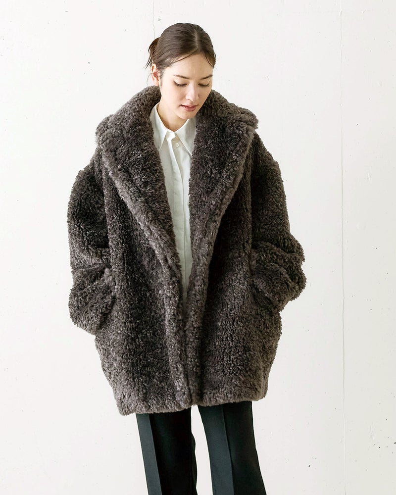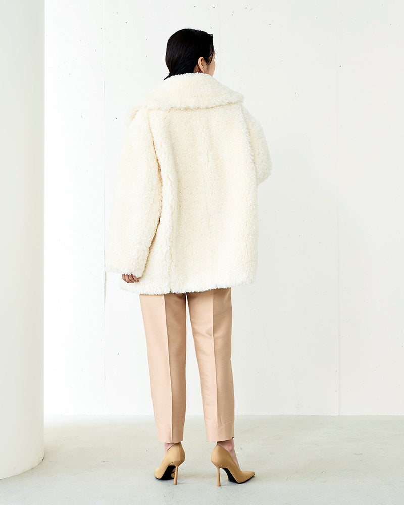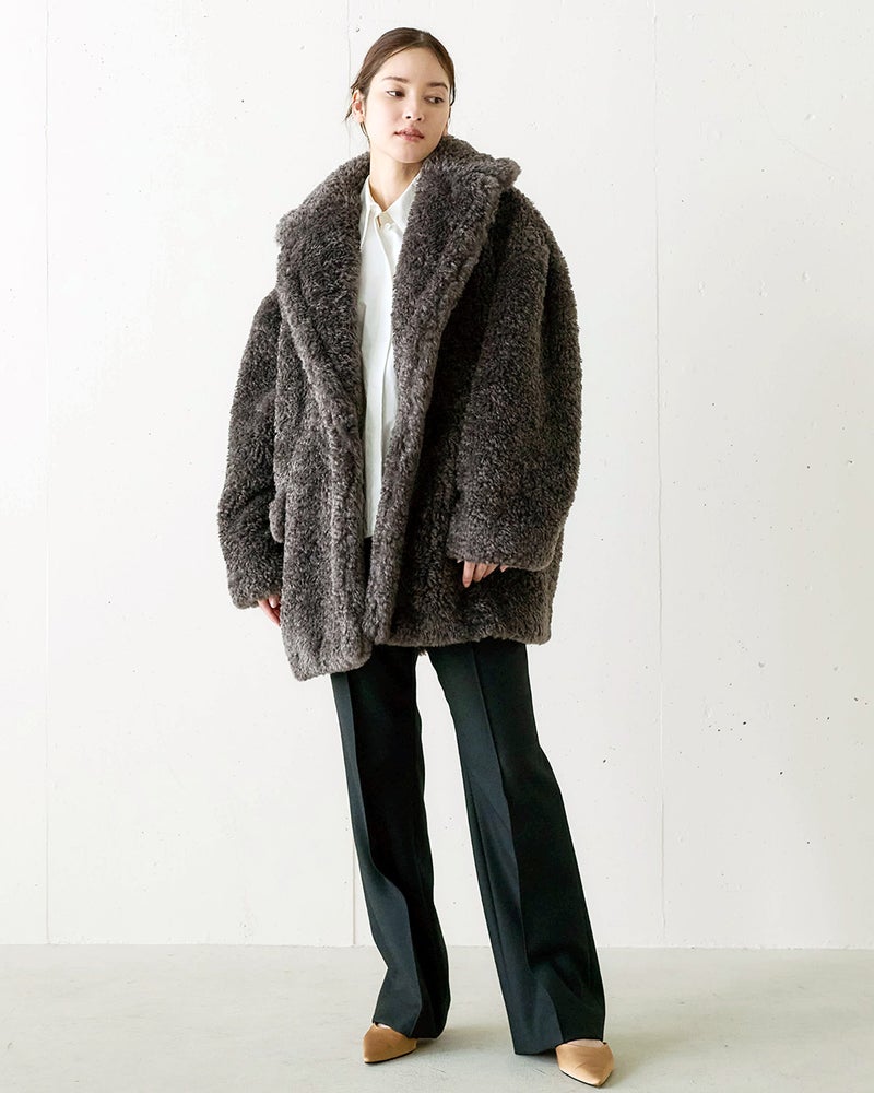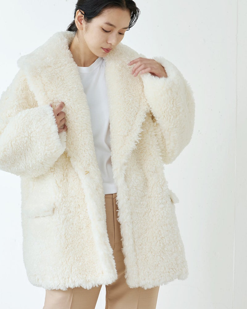 カジュアルだけどエレガント、サスティナブルなのにラグジュアリー。軽い着心地やイージーケアも嬉しいエコファーのアイテムは、今や大人の冬の定番。テディベアのようなモコモコのキュートな素材だからこそ、あえてデザインは身体を包み込むようなダブルブレストのシックなデザインで大人の好バランスに。