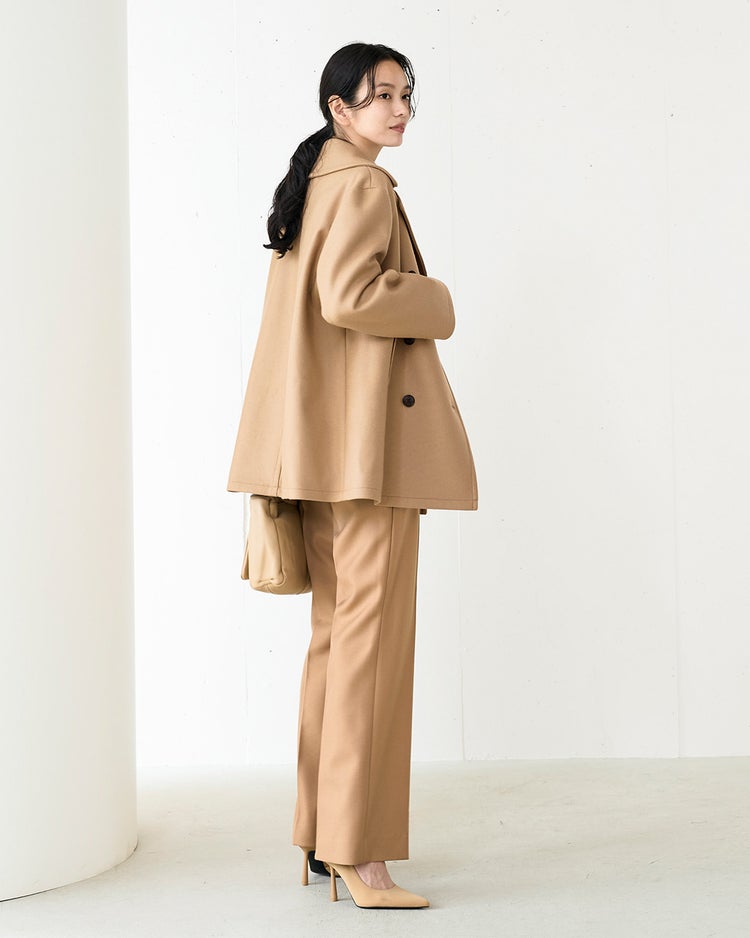 今季あらためて注目されているピーコート。オーセンティックなアイテムだからこそ、素材にも仕立てにもこだわった長く愛せる1枚に仕上げました。生涯1度しか採取できないラムズヴァージンウールを二重織りにした贅沢な素材を採用。生地ならではの微光沢とハリが、シンプルなピーコートを美しい表情に。定番のピーコートデザインは少しだけゆとりを持たせた今っぽいシルエット。中のニットなどもごろつかず、すっきりとお召しいただけます。