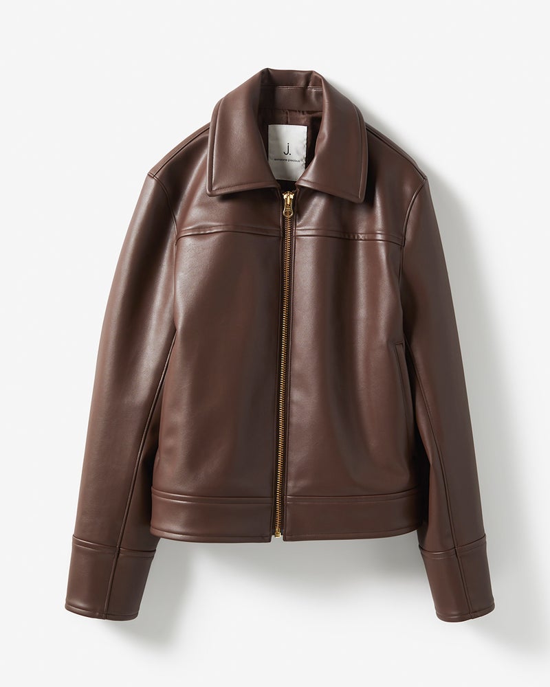 シングルライダースをベースに、軽い着心地や身体のラインを綺麗に見せるジャストなシルエットで大人の女性に似合う1着を追求したのがこちら。素材はなめらかな表面感とやわらかな着心地を両立したサスティナブルレザー。コンパクトな着丈はシックなワイドパンツから華やかなボリュームスカートまでどんなコーデにもマッチ。
